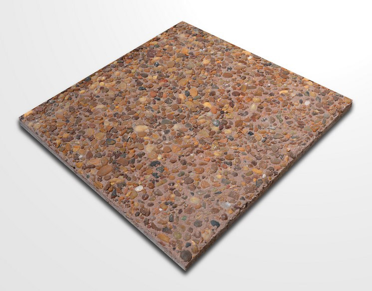 Baldosa Prensada Piedra Lavada canto rodado sobre fondo rojo, apta para Espacios de Alto Transito. Medida 40x40 cms, espesor 2,8cms.